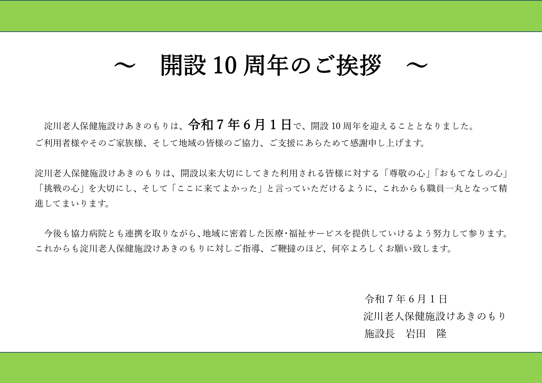 開設10周年のご挨拶 更新日:2025年6月24日 公開日:2025年6月16日 お知らせ 20250616_開設10周年のご挨拶 投稿ナビゲーション けあき通信 (2025年春号)を掲載しました!面会についてのご案内